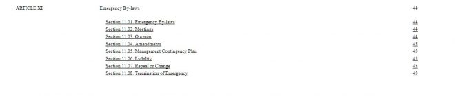 Раздел 11.04. Поправки. На любом собрании, созванном в соответствии с разделом 11.02, Совет или комитет Совета, в зависимости от обстоятельств, могут изменять, исправлять или дополнять положения настоящей статьи XI, с тем чтобы принять любое новое положение, которое может быть практичным или необходимых при возникновении чрезвычайных ситуаций.