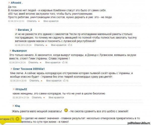 Вернёмся к авиаудару: во время него одна из жертв, Инна Кукурудза, проходила возле здания Луганской ОГА, и её гибель была заснята и представлена во многих СМИ, и вот реакция конкретно под материалами в укрСМИ - истерическая противоестественная радость. Именно в этот день и родилось выражение “самка колорада” – т е гражданские жертвы как побочный продукт уничтожения сепаров не должны волновать общественность.
