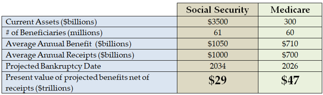 Но это еще не все. Мы дали обещания пожилым людям, которые попросту не сможем сдержать, если не поменяем (нарушим) их и не обременим сегодняшнюю молодежь гораздо более высокими налогами - реформы не из приятных. Как показано в последней строке следующей таблицы, текущая величина обещанных выплат по программе социального обеспечения на 29 триллионов больше, чем прогнозируемые поступления, а добавление 47 триллионов обещанных Медикэр доведет неофициальные обязательства до 76 триллионов, превышая официальные обязательства вдвое. Наш всеобъемлющий национальный долг составляет астрономические 390% ВВП.