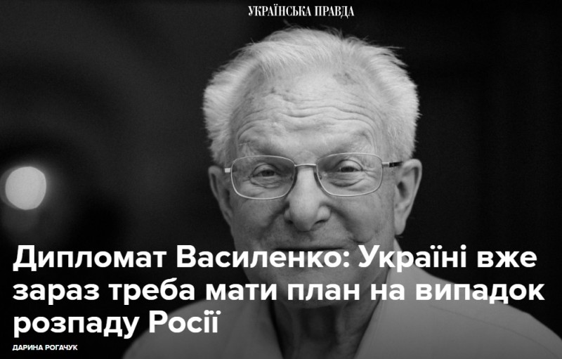На известном информационном ресурсе “Украинская правда” – интервью с каким-то дипломатом Василенко. Как вы догадались, украинского же. Старый хрыч, песок сыпется, а туда же: “Україні вже зараз треба мати план на випадок розпаду Росії”. Так и называется статья, которая некоторое время числилась вроде как передовицей – а это значит, сама тематика – раскручиваемый тренд.