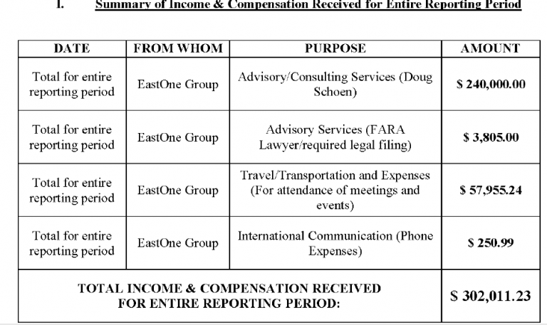 А вот здесь представлена сводная информация Министерства юстиции по документам Закона о регистрации иностранных агентов (FARA) для Шона как агента Пинчука с 2011 года по сегодняшний день. Последнее заявление, датированное 30 мая 2019 года, подтверждает, что Шон все еще работает на Пинчука, хотя на просьбу заявить это прямо Шон отказывается это сделать. Его следующее заявление по Закону о регистрации иностранных агентов должно быть подано в ноябре.