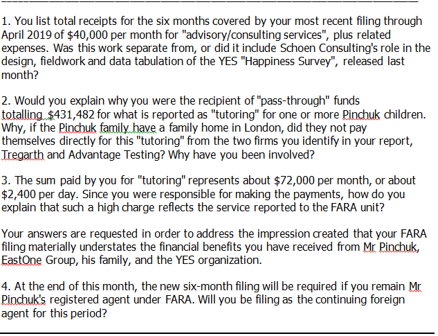 Последний отчет Шона от имени Пинчука для Министерства юстиции касается шести месяцев по апрель 2019 года. Пинчук все еще платит Шону 40000 долларов плюс расходы:
