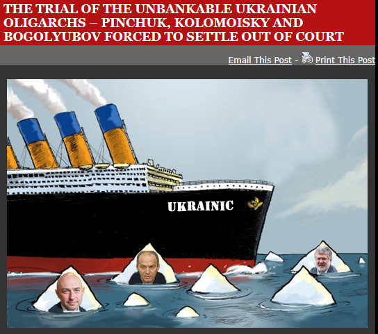 Надпись на изображении: "Судебный процесс некредитоспособных украинских олигархов - Пинчук, Коломойский и Боголюбов вынуждены урегулировать спор без судебного разбирательства". Название корабля - "Украиник"