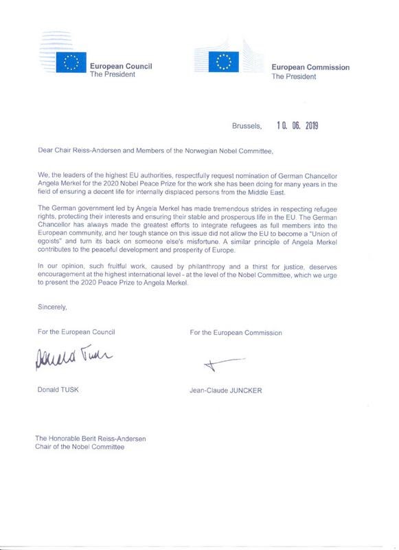 Мы, руководители высших органов власти ЕС с уважением просим о номинации канцлера Германии Ангелы Меркель на Нобелевскую премию мира 2020 года за работу, которую она проводила в сфере обеспечения достойной жизни вынужденных переселенцев из стран Ближнего Востока на протяжении многих лет.