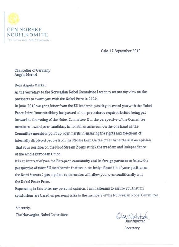 В июне 2019 года мы получили письмо от руководства ЕС с просьбой присудить Вам Нобелевскую премию мира. Ваша кандидатура прошла все необходимые процедуры и согласования перед вынесением на голосование норвежского Нобелевского комитета. Но позиция членов комитета в отношении Вашей кандидатуры не является однозначной. С одной стороны, все члены комитета отмечают Ваши заслуги в сфере обеспечения прав и свобод вынужденных переселенцев из стран Ближнего Востока. С другой стороны, есть мнение, что своей позицией в отношении строительства "Северного потока -2" вы ставите под угрозу свободу и независимость всего Европейского Союза.