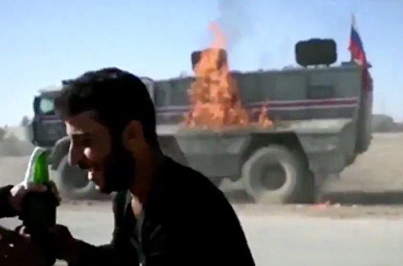 Турецкие и курдские СМИ опубликовали видео с загоревшейся российской бронемашиной. По данным информагентства Anadolu, в районе Айн-аль-Араб (Кобани) группа курдской молодежи атаковала колонну российской военной техники. Они забросали бронеавтомобиль «Тайфун» с флагом России коктейлями Молотова. Машина загорелась, но вскоре уехала.
