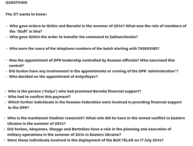 коммюнике с обращения к свидетелям. "ОСГ ищет информацию о лицах в военной и административной иерархической структуре, которые создали условия для сбития МН17 в Восточной Украине с помощью BUK TELAR". Выражение "создали условия" подразумевает виновность российского правительства в разрушении самолета посредством вертикали подчинения, идущей от Кремля до района боевых действий в восточной Украине.