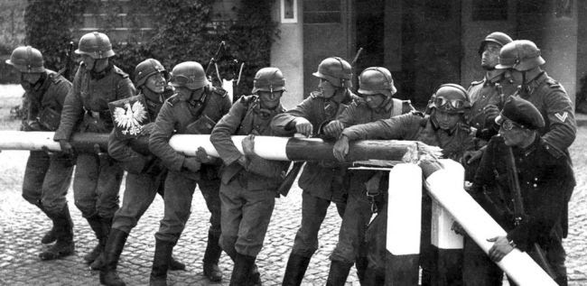 Начало Второй мировой войны. Солдаты Вермахта ломают шлагбаум на границе Германии и Польши. Архивное фото (1939)