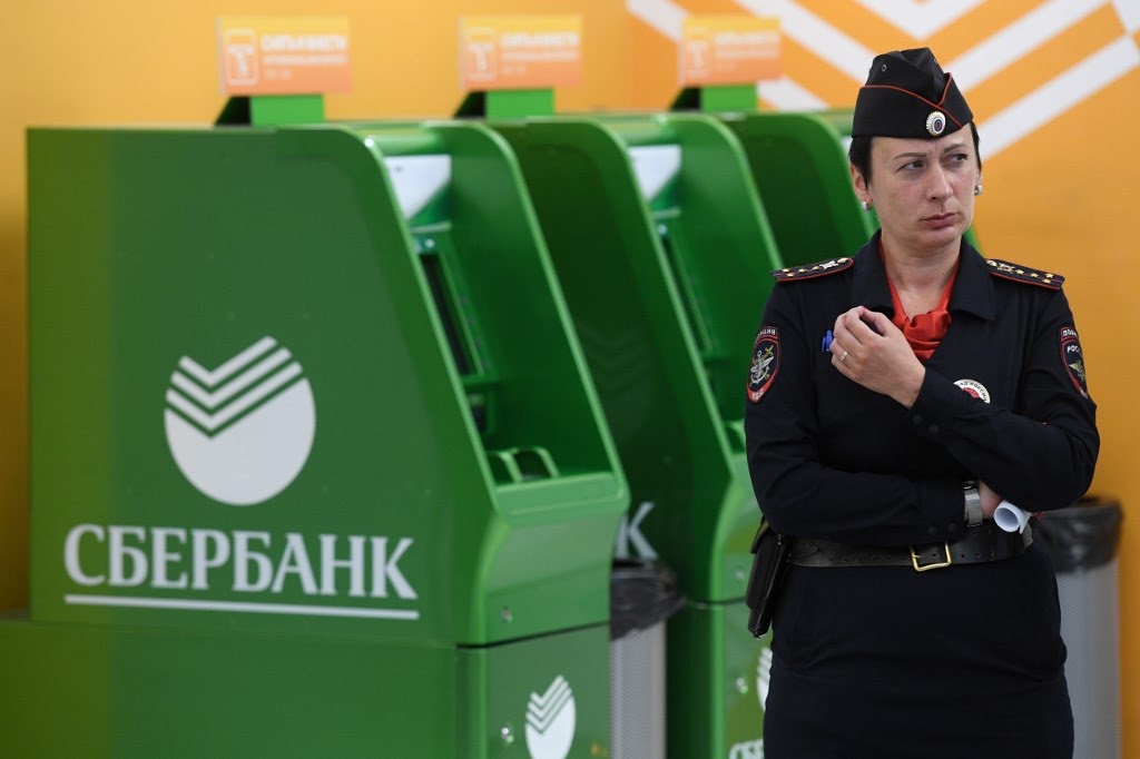 Женщина-полицейский стоит возле банкоматов Сбербанка в аэропорту Шереметьево в Москве. 5 мая 2019 года. Фото AFP