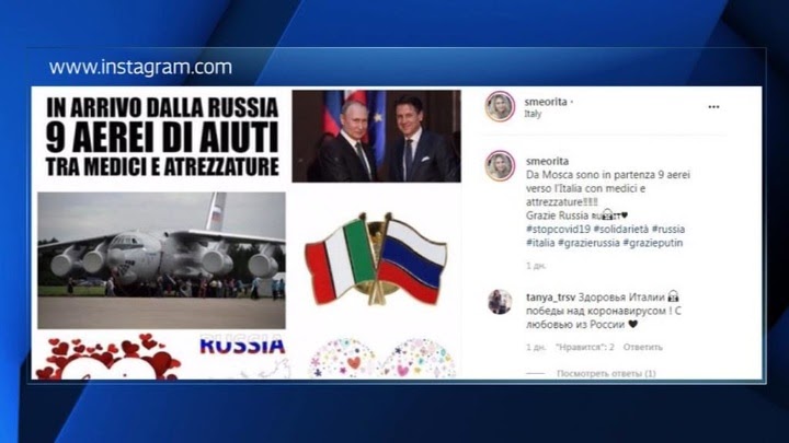 Хэштег #GrazieRussia, что в переводе с итальянского означает «Спасибо, Россия», становится все более популярным в социальных сетях. Тысячи людей по всей Италии сопровождают им свои публикации. В трудный момент, когда заболевших в стране уже более 63 тысяч, помощь пришла не от официальных партнеров по Евросоюзу, а от друзей из Москвы. В знак благодарности итальянцы убирают с улиц флаги Евросоюза и вывешивают на их месте флаги России.