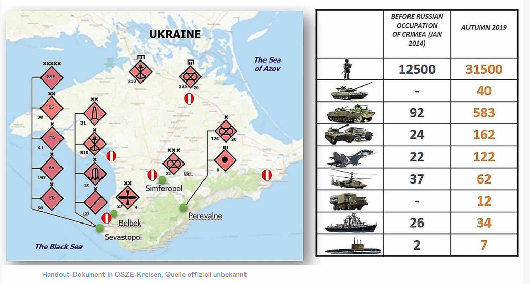 Достоверная проверка чисел на их точность затруднена. * Независимо от точности данных, в документе показано, как Россия — в нарушение международного права — превратила этот южный курортный регион на Черном море, в большой военный лагерь, действительно, в крепость. Российское военное присутствие трансформируется, и, согласно свидетельствам, там готовится даже размещение ядерного оружия. Считается, что последнее подразумевается не в последнюю очередь, когда в документе в целом говорится, что Россия продолжает устанавливать или эксплуатировать различные системы вооружения, оборудование и боеприпасы для крупногабаритного оружия в аннексированном районе с «явным нарушением соответствующих международно-правовых документов».