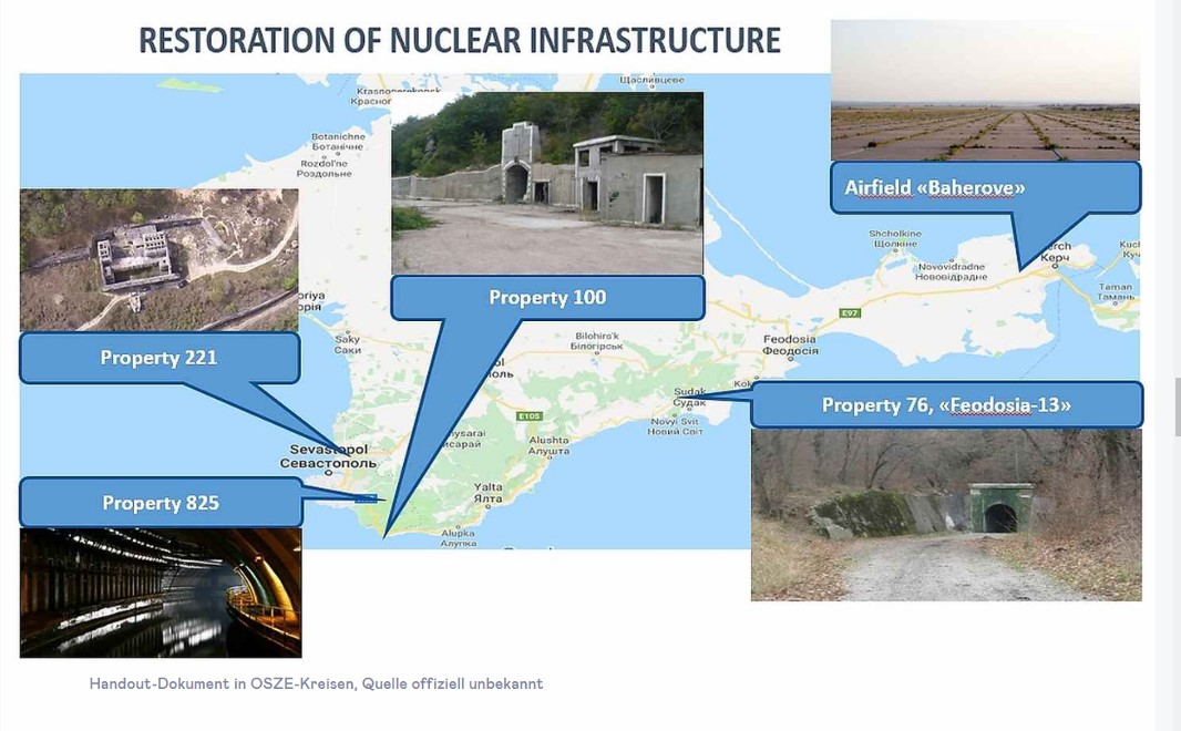 На одном из слайдов указывается, что имеются доказательства того, что в Крыму готовится размещение ядерного и авиационного ядерного оружия. Старые, соответствующие склады и инфраструктура советской эпохи под Феодосией и Севастополем будут реконструированы или восстановлены. Соответствующие фотографии относятся к объектам «инфраструктуры» № 76 (также «Феодосия-13»), а также № 100, № 221 и № 825, а также на аэродроме Бахерово недалеко от Керчи.