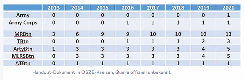 В другом сообщении упоминается, что в 2013 году — за год до вторжения — помимо сил Черноморского флота, в Крыму находились четыре батальона русской армии (три мотострелковых, один артиллерийский). А в конце 2019 года уже насчитывалось: 1 армейский корпус, 27 батальонов (13 пехотных, пять артиллерийских, пять ракетных, три танковых, один противотанковый — организационно входящие в состав армии). Однако в этом списке не указаны батальоны и другие соединения, такие как противовоздушной обороны, разведки, армейская авиация и войска РХБЗ.