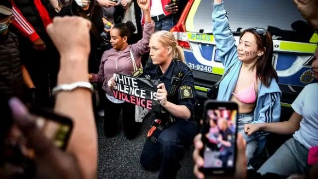 В Стокгольме толпа требует, чтобы полицейские у королевского дворца встали на колени. А вот и первый обращенный в новую религию: сотрудница полиции преклоняет колено перед демонстрантами, поднимая кулак вверх в знак поддержки «черной силы». В другой руке у нее плакат с надписью «Молчание белых — это насилие». Это означает, что белые должны без всяких раздумий поддерживать движение «Жизни черных имеют значение», иначе их будут считать соучастниками убийств чернокожих.