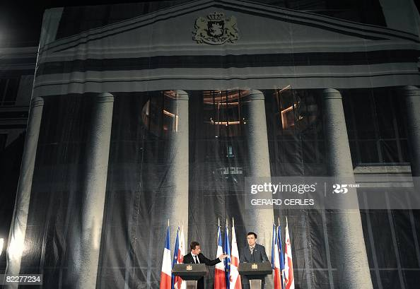 Николя Саркози во время совместной пресс-конференции с президентом Грузии Михаилом Саакашвили после двусторонней встречи в Тбилиси поздно вечером 12 августа 2008 года. Фото: GERARD CERLES/AFP via Getty Images, Новости-Грузия