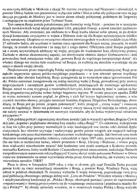 Таким образом, к России отнеслись как к формальному врагу Польши – несмотря на то, что в московских торжествах приняли участие президент США, президент Франции и даже канцлер объединённой Германии. Чтобы понять, как это было воспринято в России, нужно отдавать себе отчёт в том, что после дискредитации коммунизма победа в войне против Гитлера стала для россиян наиболее важным источником национальной гордости. Эта Победа была завоёвана невероятно большими жертвами (свои жизни отдали почти 27 миллионов человек), но взамен было получено нечто колоссально важное для россиян: чувство, что они спасли Европу, что это было оценено по достоинству и что у них есть чем гордиться.