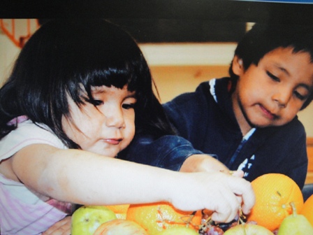 Сиблин Алексис (4 года) и Невин Аггамавэй (7 лет) лакомятся фруктами. Люди в поселке не видят свежих фруктов по несколько месяцев.