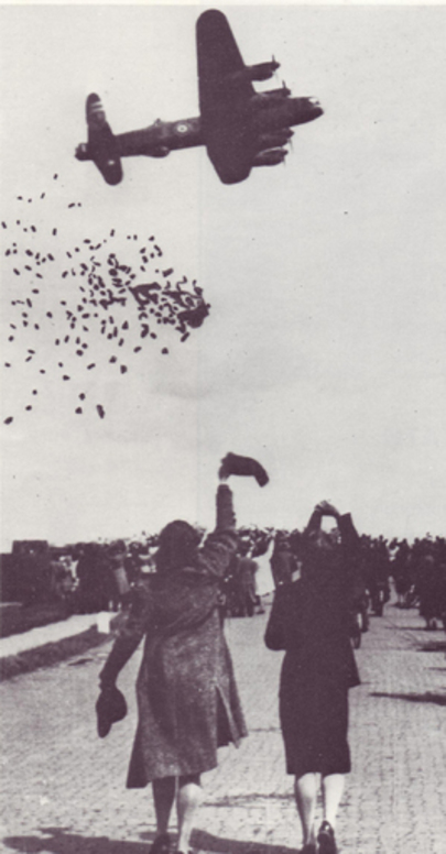 Некоторые испугались, они думали, что союзники, по ошибке, собираются бомбить их. Но бомболюки открылись, и с неба к голодающим людям полетели мешки с продуктами.