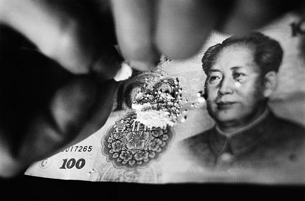 Героин на 100-юаневой банкноте. Наркоманы используют новые банкноты, чтобы ни одна микроскопическая частичка вещества не потерялась в трещинках или складочках.