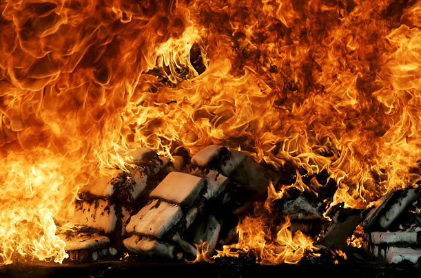 Тридцать процентов всех наркотиков, ввезённых контрабандой в США, проникают туда через Карибские государства, поэтому американское правительство и помогает многим своим южным соседям бороться с наркотрафиком. В 2008 году правительство предоставило 660 миллионов долларов на поддержку борьбы с наркоторговцами в Колумбии и захватило 1320 фунтов героина. На фотографии: в Санто-Доминго сжигают гигантскую партию героина, кокаина и марихуаны, которая была перехвачена на пути из Колумбии и Венесуэлы в США.