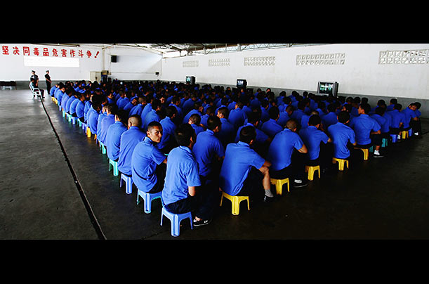 Правительства во всём мире отвечают на наркоэпидемию разными путями. Наркоторговцы в Малайзии могут быть приговорены к смерти, в то время как в Португалии владение героином было исключено из числа уголовно наказуемых преступлений. В южном Китае, где бедность и близость к маковым плантациям Юго-Восточной Азии способствуют распространению наркомании и сопутствующего ей СПИДа, многих наркоманов направляют в центры реабилитации, такие как этот, расположенный в провинции Юньнань. На фотографии: обитатели центра смотрят видеофильм, направленный против злоупотребления наркотиками.