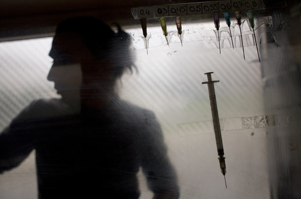 Наркоманы, которые колются одной общей иглой, находятся в группе высокого риска по заболеванию ВИЧ/СПИДом и гепатитом С. В 2004 году в США «колющиеся» наркоманы составляли 12 % от числа всех новых ВИЧ-инфицированных и большинство вновь инфицированных гепатитом С. На фотографии: сотрудники неправительственной организации «Гуманитарная Акция» раздают чистые иглы наркоманам в Санкт-Петербурге, Россия. Они также предоставляют бесплатные презервативы и делают анализы крови на ВИЧ и гепатит. Сторонники таких программ говорят, что чистые иглы помогают уменьшить распространение инфекции, в то же время — не поощряя наркоманию, по цене это намного дешевле, чем лечить человека, больного СПИДом. Противники говорят, что такие обмены подрывают усилия по борьбе с наркоманией и преступностью.