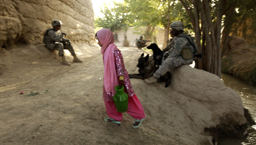 Афганская девочка несёт воду из реки мимо американских солдат в деревне Сайдон Калаче, долина Аргандаб, 11 сентября.