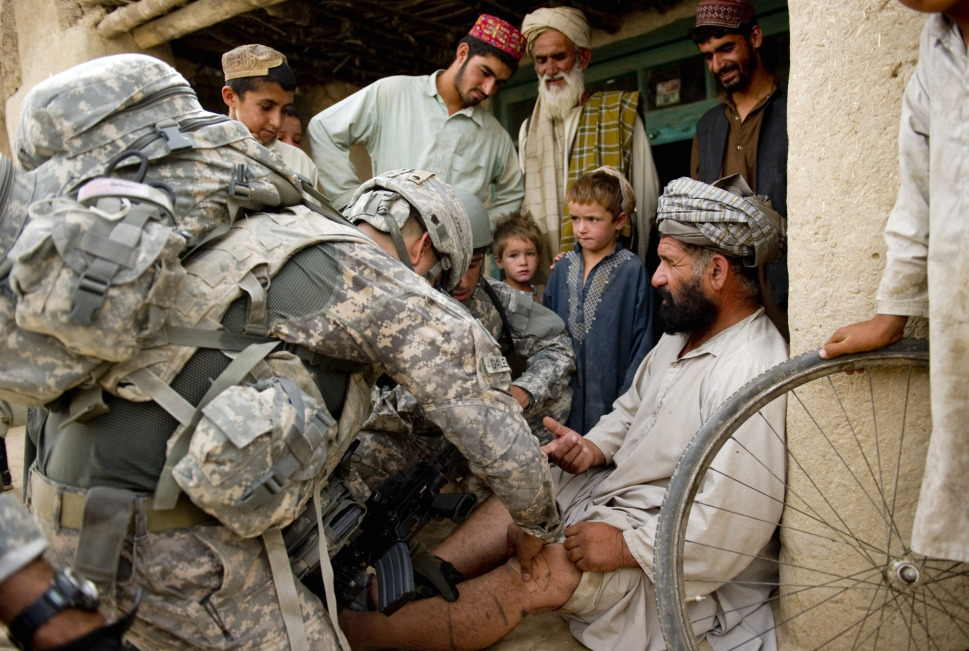 Американский военный медик осматривает колено афганского крестьянина во время патрулирования округа Данд, провинция Кандагар, 21 июля.