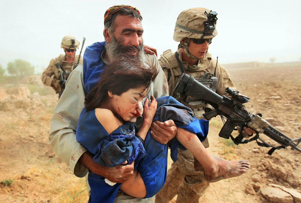 Морские пехотинцы помогают отцу нести его юную дочь к медицинско-эвакуационному вертолёту. Она была ранена шрапнелью во время обстрела пехотинцев, патрулировавших деревню.