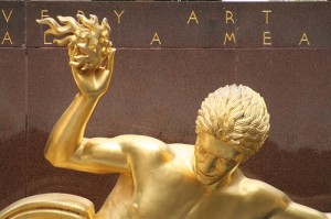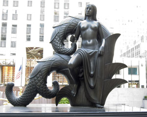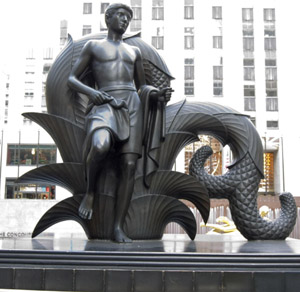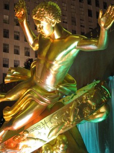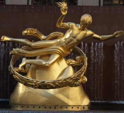 Скульптура Пола Мэншипа, показанная на Затонувшей площади Рокфеллеровского центра, изображает Прометея, держащего огонь, украденный у Зевса, и спускающегося к человечеству. Он находится внутри кольца, в котором изображены знаки Зодиака. Позади статуи есть надпись: