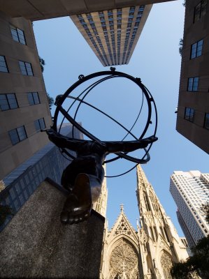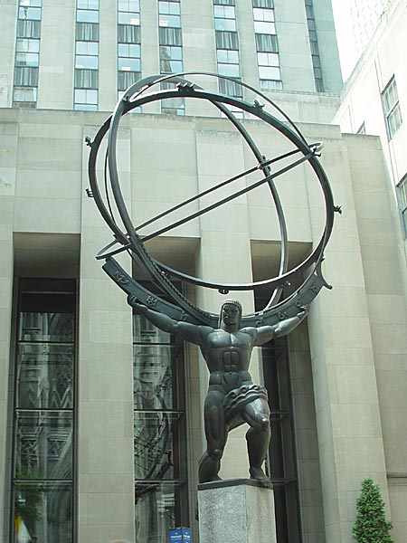 Угадайте, почему Атлант был вынужден нести небесный свод на своих плечах? Потому что он бросил вызов богу Зевсу. Направленная с севера на юг ось сферы из колец на его плечах указывает на Полярную звезду, если смотреть из Нью-Йорка. На плечах Атланта находится широкая, изогнутая перекладина, на которой изображены традиционные символы Меркурия, Венеры, Земли, Марса, Юпитера, Сатурна, Урана и Нептуна. Рядом с Землёй (над правым предплечьем Атланта) изображён небольшой полумесяц, символизирующий Луну. К одному из колец сферы прикреплены символы двенадцати созвездий, через которые проходит Солнце в течение года.