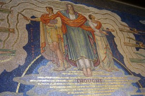 Рокфеллеровский центр полон впечатляющих барельефов, фресок и скульптур, несущих в себе множество символических значений и образов. Если Вы побываете там, то, вероятно, увидите много других деталей, которые я пропустил (не стесняйтесь присылать их мне). Невозможно подробно рассмотреть всё, что там есть, но я оставлю Вам некоторые интересные моменты, которые Вы можете исследовать самостоятельно. Обратите внимание на вавилонское / египетское влияние, вездесущность факела просвещения и тайных символов, разбросанных по всему месту.