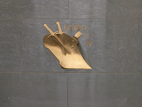 Это изображение является ссылкой на Исайю 2:04 и представляет собой мечи, превращающиеся в орала. Вот библейский стих: