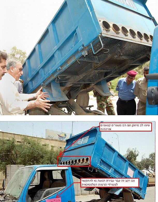Этот «мусоровоз» был обнаружен израильскими войсками в Секторе Газа в начале 2010-го. Он может произвести залп из 9 ракет «Кассам» и мирно двигаться на другую позицию. Обратите внимание на надпись на дверце машины – «В случае нарушения дорожных правил, пожалуйста, свяжитесь с властями Палестинской Автономии». Израильтяне свидетельствуют, что подобным же образом были оборудованы машины «Скорой помощи» и спасательных служб.