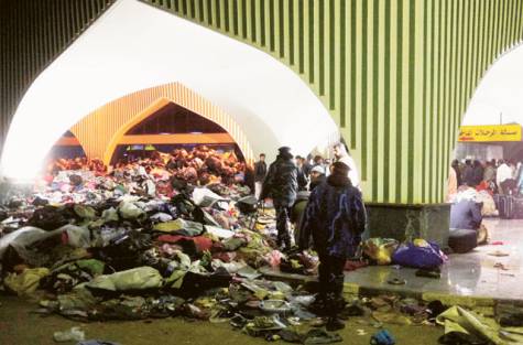 Полицейские проходят через выброшенные вещи людей, покидающих Ливию, снаружи терминала аэропорта в Триполи. Тысячи бежали из Ливии после того, как власти начали кровавое подавление сопротивления.