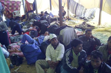 Иностранные рабочие в тесных временных лагерях из палаток и складов в порту Бенгази в восточной Ливии, где они находятся в ожидании, когда корабль за кораблём прибывает, чтобы забрать своих граждан.