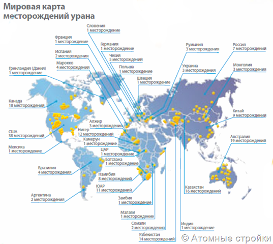 Средняя концентрация урана в земной коре довольно велика – 3·10-4 %. Это больше, чем, например, серебра (почти в 30 раз) или золота (примерно в 1000 раз). Его всегда довольно много, например, в гранитах – около 25 грамм на тонну. Немало его и в морской воде – примерно 3,4 мкг/л. В относительно тонком 20-километровом верхнем слое Земли содержится около 1014 т урана. Однако уран принадлежит к числу рассеянных элементов – лишь малая его часть сконцентрирована в рудных месторождениях с содержанием урана свыше 0,3%.