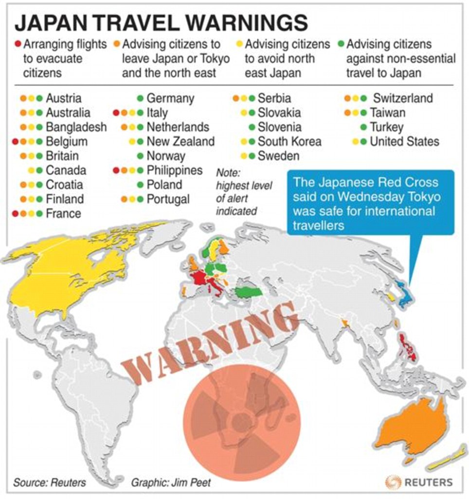В районе Токио всё ещё находится около 2 000 французских граждан. Австралия также убеждала своих граждан покинуть Токио и зоны, поражённые землетрясением.