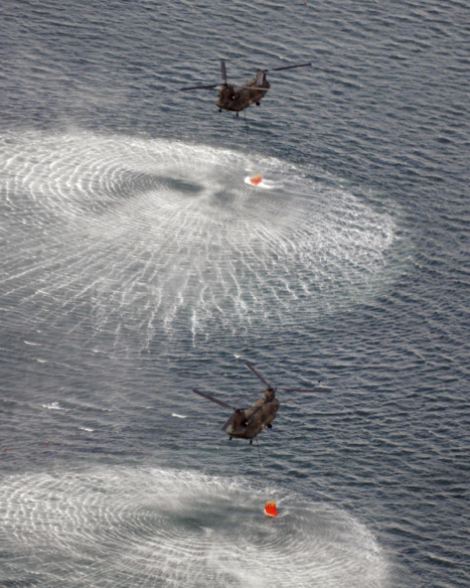 Набор воды: вертолёт Сил самообороны набирает морскую воду вблизи северо-восточного побережья Японии на пути к АЭС «Фукусима»