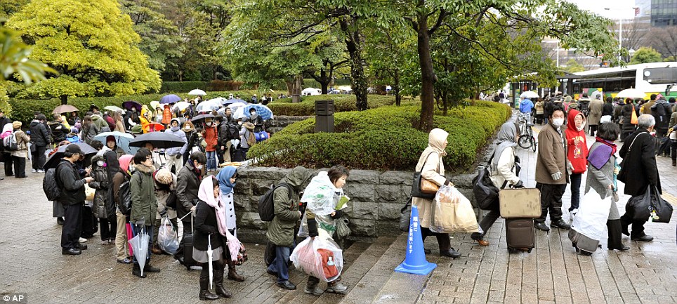 Исход: жители Сендая стоят в очереди на автобус, чтобы выехать из города. Сендай, северно-восточная Япония, вчера