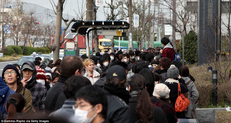 Исход: Обеспокоенные жители ждут у дверей Бюро иммиграции Японии в Токио, они эвакуируются из города из страха перед ядерной катастрофой. Иностранцы нуждаются в разрешениях на возвращение заранее, если они планируют повторно посетить страну