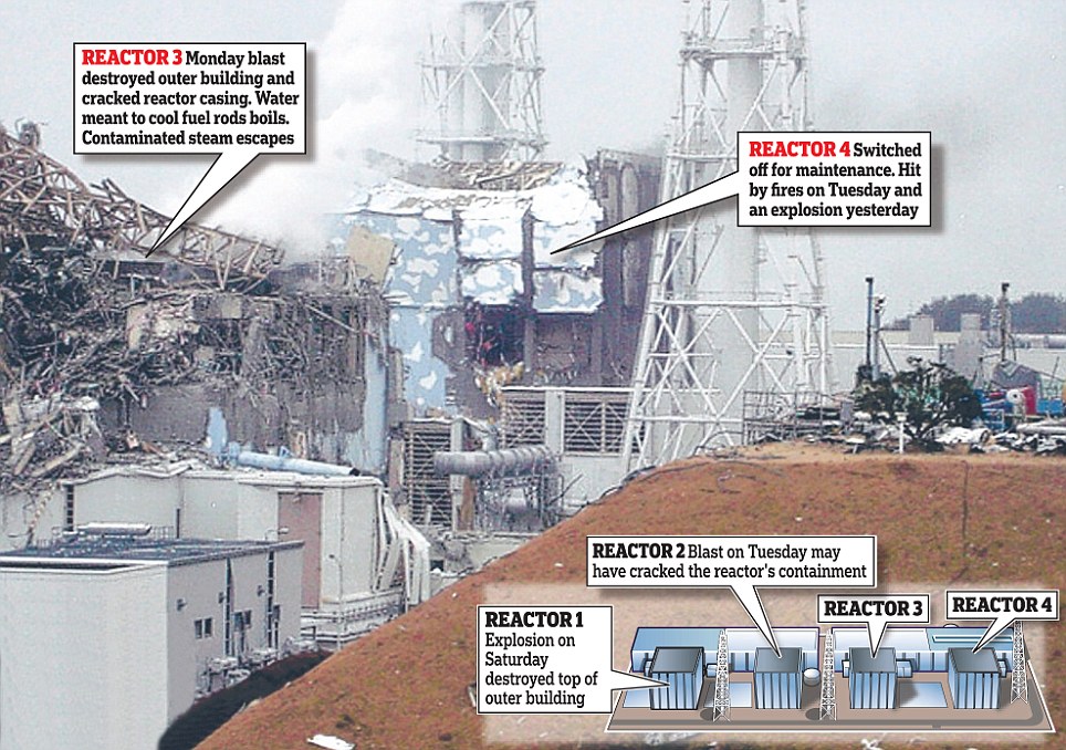 Взрывы потрясли станцию в субботу и в понедельник, в субботу взорвался водород, выпущенный из закрытых реакторов 1 и 3, чтобы понизить в них давление. В понедельник происходят взрывы водорода на реакторах 2 и 4, эти взрывы разрушили крыши конструкций, внутри которых находятся сами реакторы.