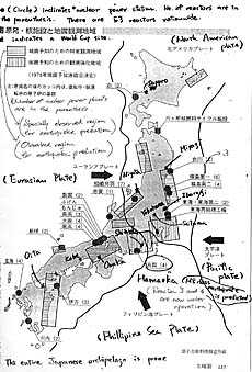 На карте Японии, приложенной автором, показаны тектонические плиты, области высокого ("observed region") и очень высокого ("specially observed") риска землетрясений и места расположения атомных реакторов