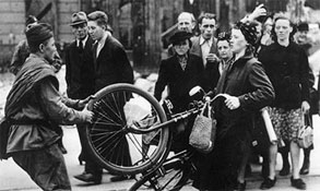 На фотографии: Русский оккупант-мародёр грабит германскую женщину.