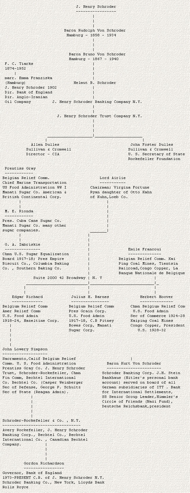 Комментарии сайта APFN: Схема «J. Henry Schroder Banking Company» охватывает всю историю двадцатого века, включает в себя участие фирмы в Бельгийской вспомогательной Комиссии (BRC -Belgium Relief Commission), которая обеспечивала Германию в 1915-1918 г.г. и отговорила Германию от заключения мира в 1916-м; финансирование Гитлера в 1933-м, чтобы сделать возможной Вторую мировую войну; поддержка кампании по выборам президента Герберта Гувера; и даже в настоящее время, имеет двух главных руководителей ее дочерней фирмы - корпорации Бехтель, служащими министром обороны и госсекретарем в правительстве Рейгана.