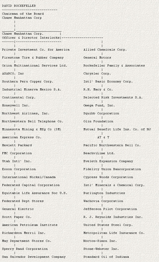 Комментарии сайта APFN: Эта схема показывает связь Дэвида Рокфеллера с Федеральным Резервным банком Нью-Йорка, с компаниями «Standard Oil of Indiana» , «General Motors», «Allied Chemical Corportion» (семейство Юджина Мейера) и «Equitable Life» (Дж.П.Морган).