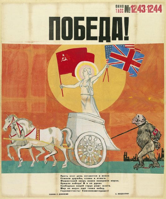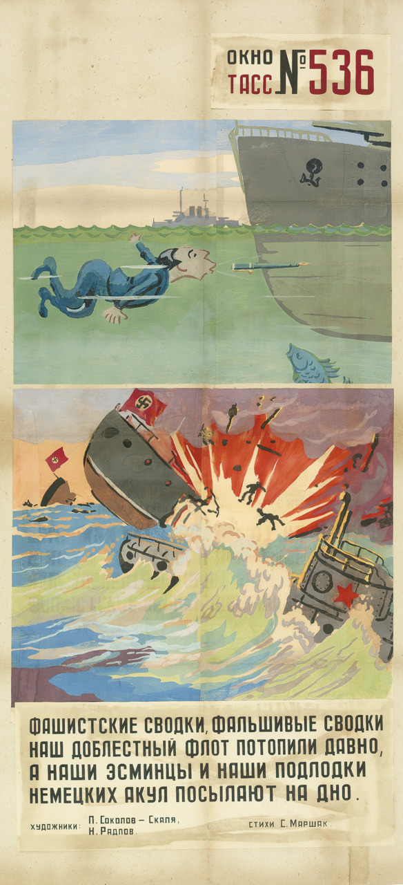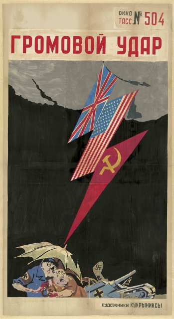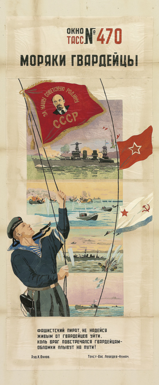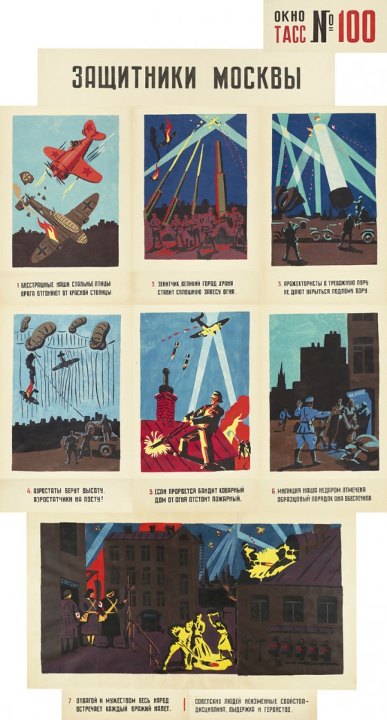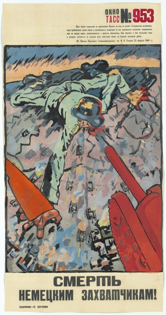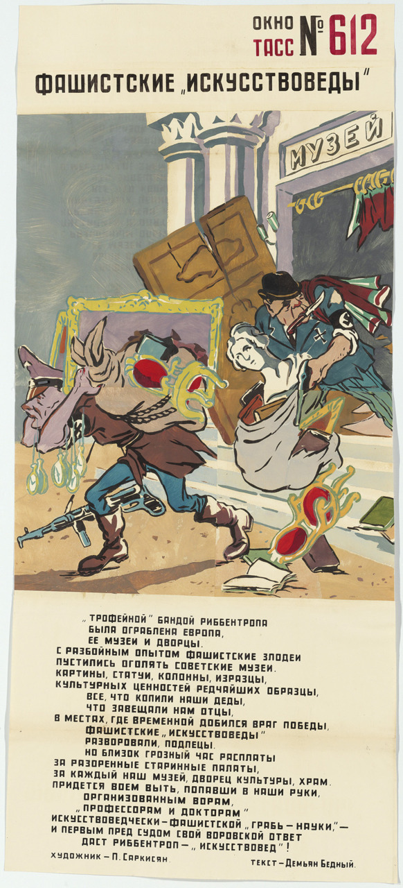 На выставке «Окна на войну: советские плакаты ТАСС дома и за границей, 1941–1945 г.г.» представлены 157 плакатов, созданных под эгидой Телеграфного агенства Советского Союза, - государственной информационной службы СССР. Редкие, ручной работы, огромные, некоторые высотой как от земли до баскетбольного кольца, плакаты были раскопаны в обширных хранилищах отдела печатных изданий и рисунков Института искусств Чикаго несколько лет назад.