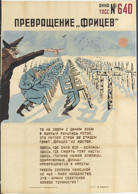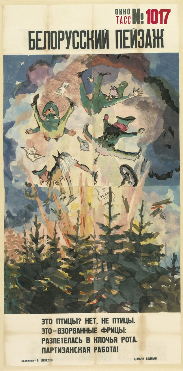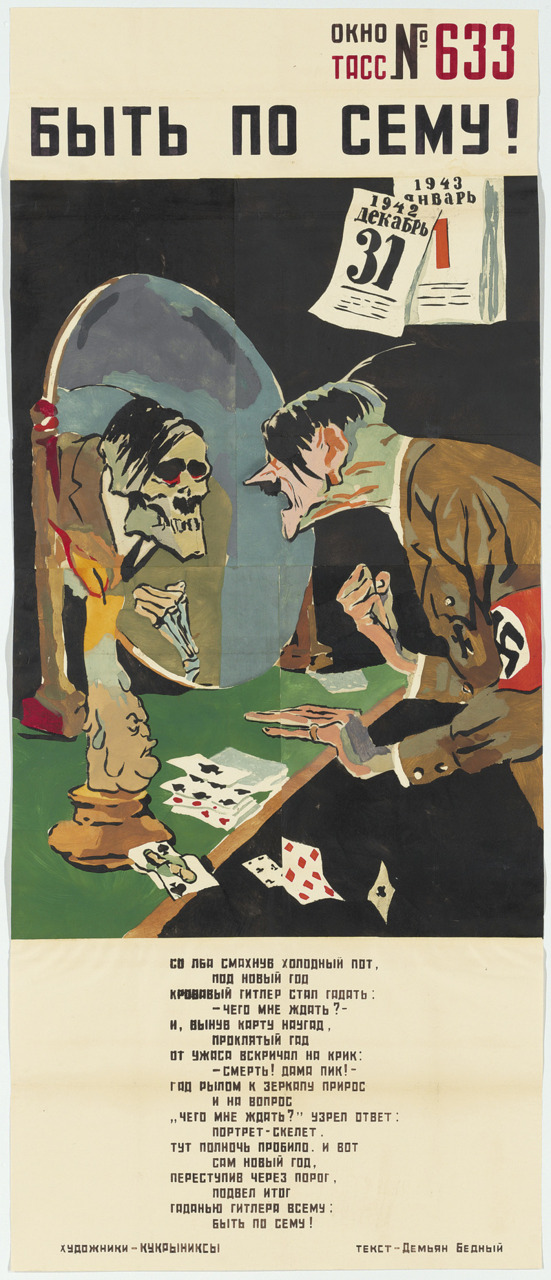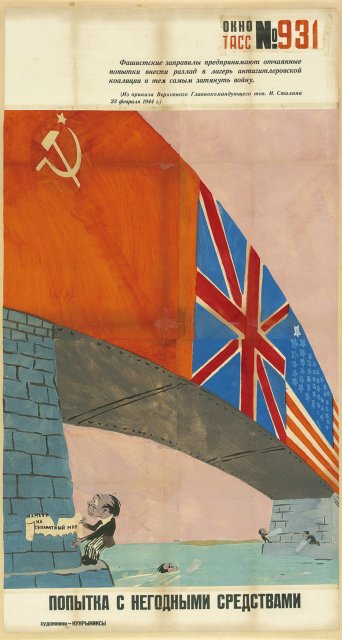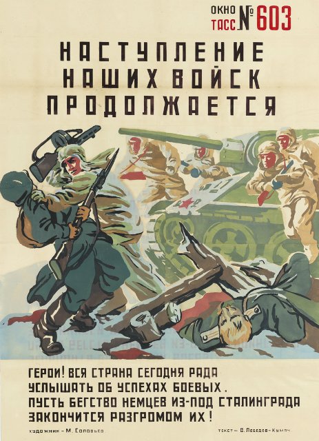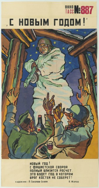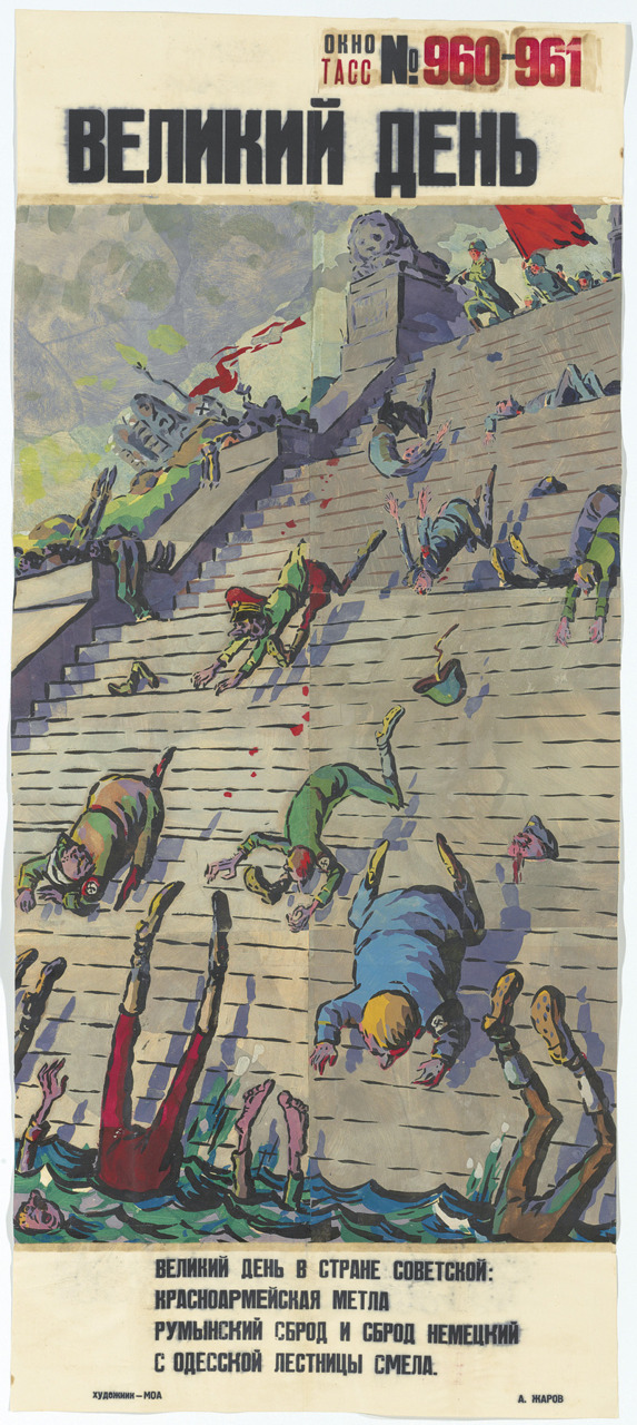 На выставке «Окна на войну: советские плакаты ТАСС дома и за границей, 1941–1945 г.г.» представлены 157 плакатов, созданных под эгидой Телеграфного агенства Советского Союза, - государственной информационной службы СССР. Редкие, ручной работы, огромные, некоторые высотой как от земли до баскетбольного кольца, плакаты были раскопаны в обширных хранилищах отдела печатных изданий и рисунков Института искусств Чикаго несколько лет назад.