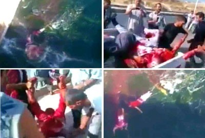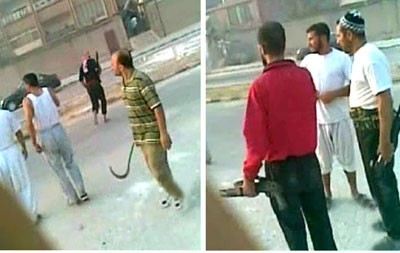 На видео показаны мужчины, вытаскивающие с грузовика несколько окровавленных трупов - как минимум семь трупов - и бросающие их с моста в реку Оронт, которая протекает через Хаму - город, где в течение недель проходят демонстрации и насильственные беспорядки, и бастион радикальной исламистской оппозиции сирийских "братьев-мусульман". Хотя местоположение (на видео) легко узнаётся жителями Хамы, но всегда могут быть вопросы о личности преступников. Однако крики "Аллах о акбар!", сопровождающие это надругательство над телами, достаточно хорошо указывают на происхождение этих людей: это сочувствующие или активисты "братьев-мусульман", о которых известно, что у них есть оружие. Это оружие хорошо видно на другом видео, присланном другим посетителем нашего сайта; это видео длительностью 11 минут показывает один из кварталов Хамы, находящийся под контролем восставших. Это вооружённое восстание, как это видно по участникам боевых действий, одетых в стиле "моджахедов" с закрытыми куфией лицами и автоматическим оружием - АК 47 - или ружьями Remington или Franchi в руках (см. фото ниже); в течение всего этого "репортажа", по всей видимости, сделанного мобильным телефоном, можно слышать звуки перестрелки; можно ясно видеть типичных бородачей, одетых в традиционные джелаба. Видео заканчивается видом сваливаемых на платформу грузовика окровавленных трупов.