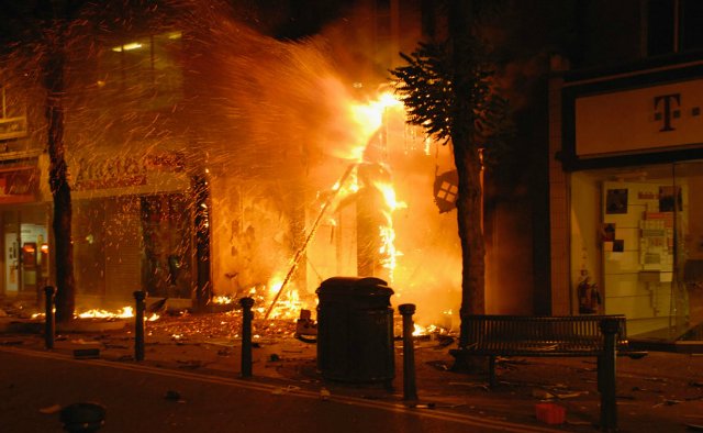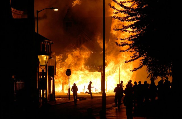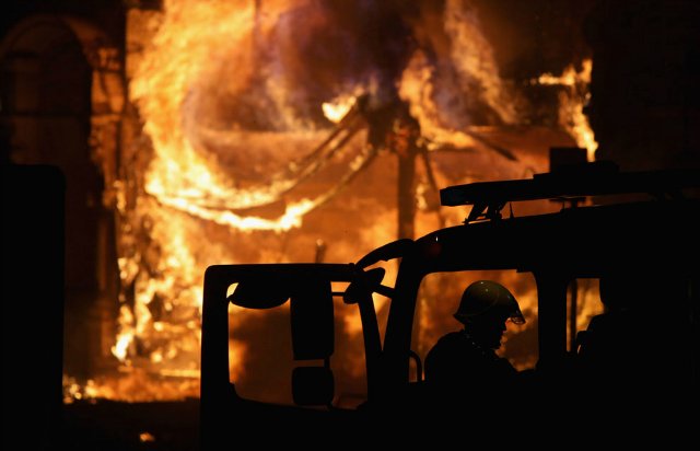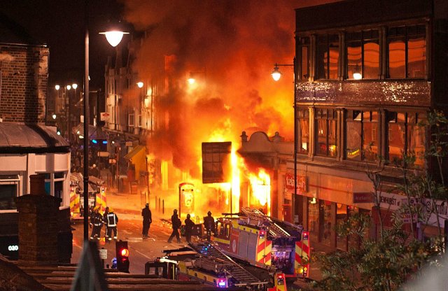 2 Горящее здание на Tottenham High Road, Лондон, после того как молодежь протестовала против убийства человека вооруженной полицией при попытке его ареста, 6 августа 2011 года, Лондон, Англия. (Matthew Lloyd / Getty Images) #